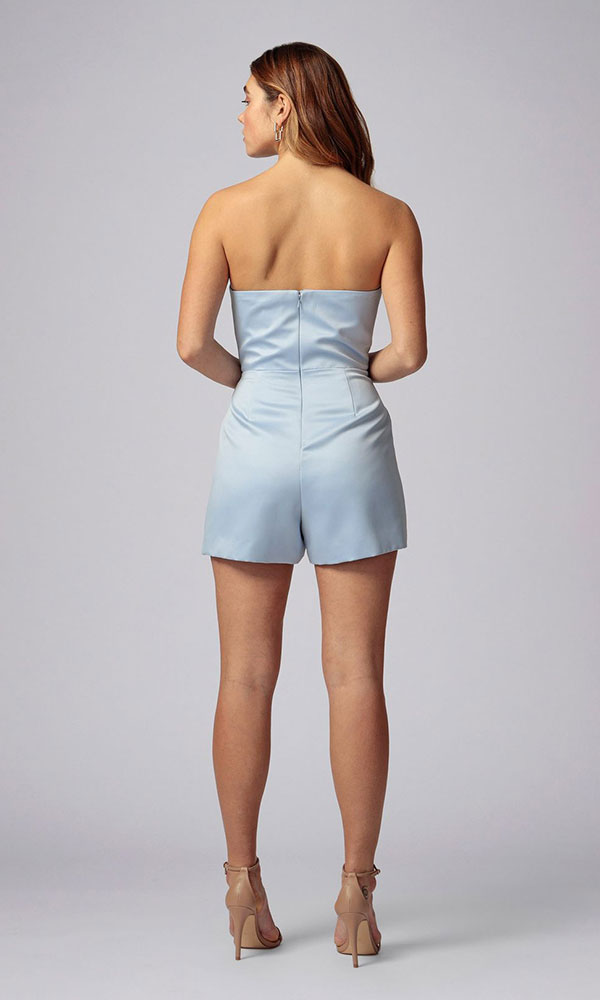 The Capri Strapless Romper with Overskirt has a mid-thigh length, strapless neckline and removable overskirt. It features a v at the bust with pleated detailing and a floor length detachable skirt in a satin d’hauteur fabric.